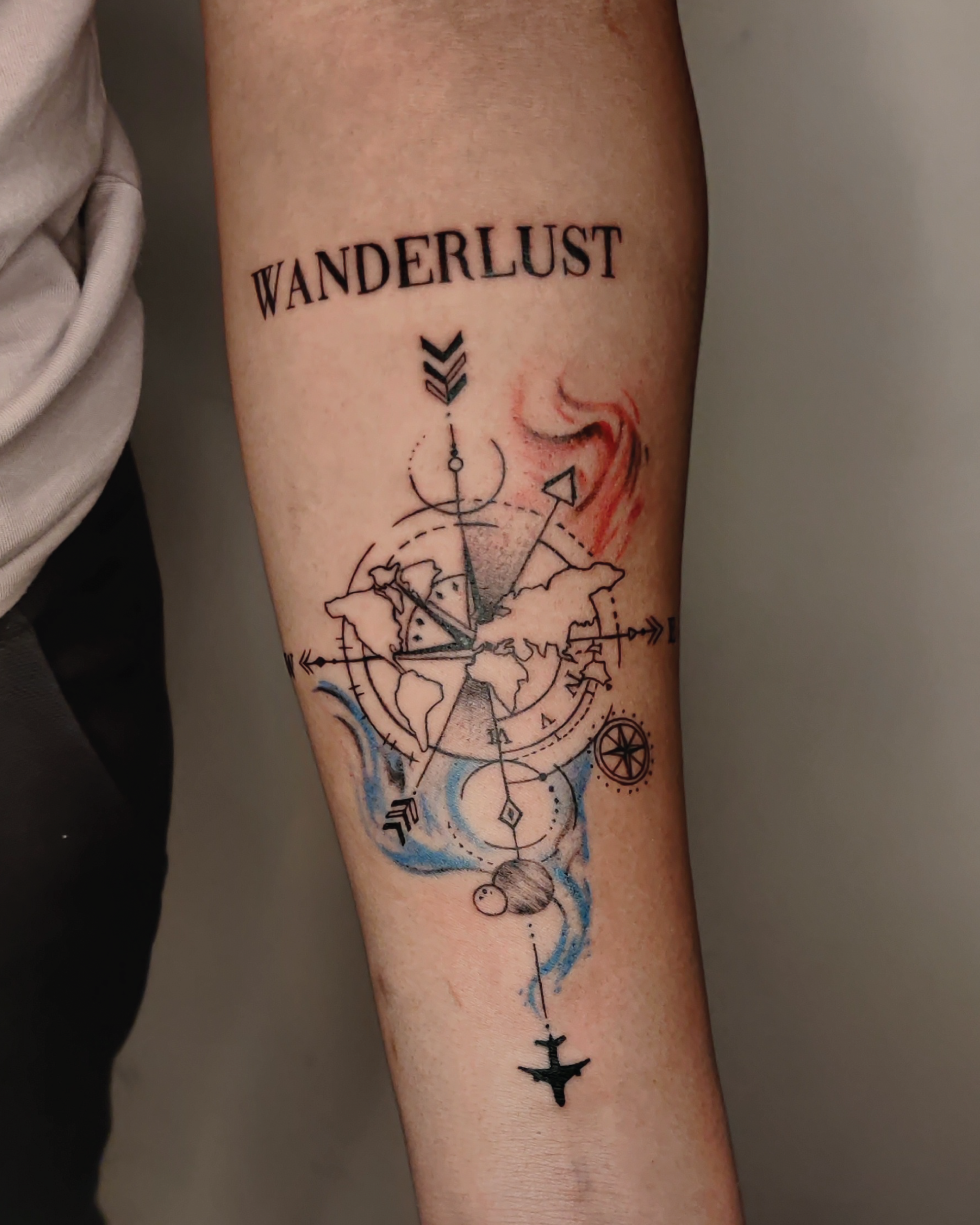Travel theme tattoos symbolize wanderlust, personal journeys, and unforgettable experiences—custom-designed with clean lines and artistic precision.